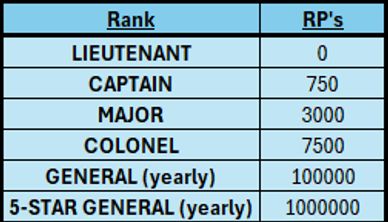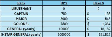 Here is the new table with rake information. This makes it easier to estimate which tier you think you will fall into. Note that the General and 5-Star General levels are based on yearly rake, so divide by 12 to get the monthly equivalents (approximately $1.5k and $15k, respectively).